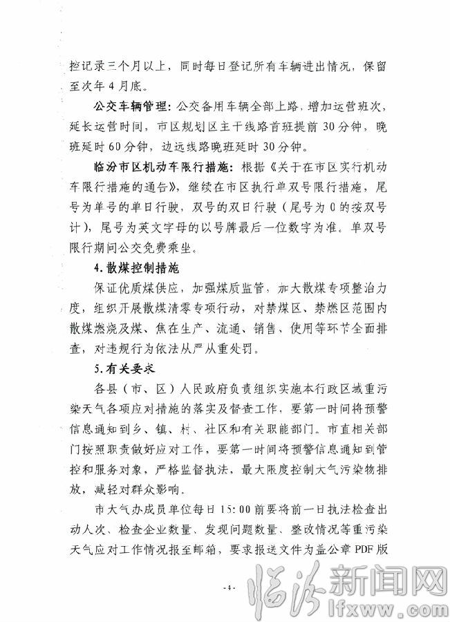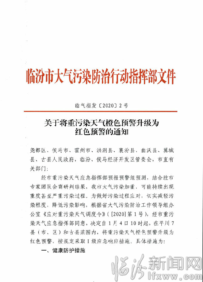 經(jīng)市重污染天氣應(yīng)急指揮部預(yù)報預(yù)警組預(yù)測,結(jié)合駐市專家團隊會商研判結(jié)果,我市大氣污染加重,可能持續(xù)出現(xiàn)重度甚至嚴(yán)重污染過程。為做好污染過程應(yīng)對,切實減輕污染程度,降低污染影響,根據(jù)省大氣污染防治工作領(lǐng)導(dǎo)組辦公室《應(yīng)對重污染天氣調(diào)度令》([2020]第1號),經(jīng)市重污染天氣應(yīng)急指揮部同意,決定自1月4日10時起,在平川7縣(市、區(qū))和古縣范圍內(nèi),將重污染天氣橙色預(yù)警升級為紅色預(yù)警,按規(guī)定采取Ⅰ級應(yīng)急響應(yīng)措施。具體措施為: