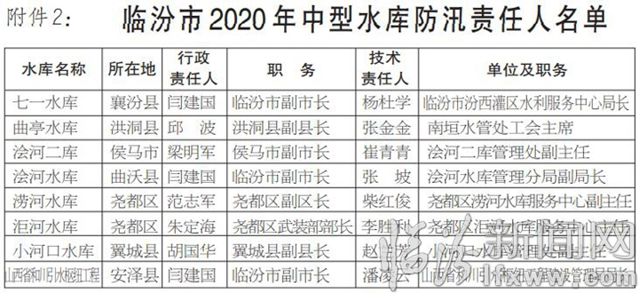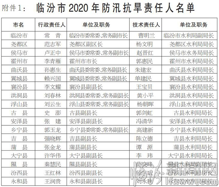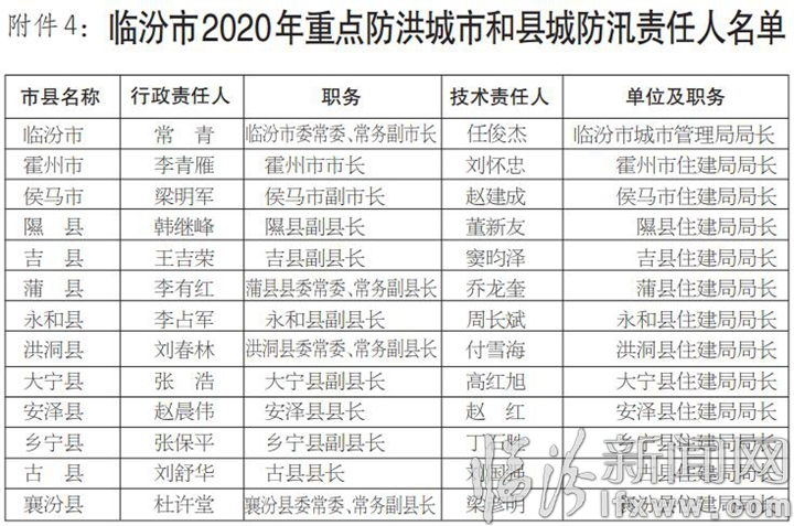 根據《中華人民共和國防洪法》、《中華人民共和國抗旱條例》和國家防總關于《各級地方人民政府行政首長防汛抗旱工作職責》的規定,結合我市實際情況,為全面做好2020年防汛抗旱工作,確保安全度汛,現將市、縣兩級防汛抗旱責任人、全市中型水庫、重點河道(段)、重點防洪城市和縣城防汛責任人予以公示。