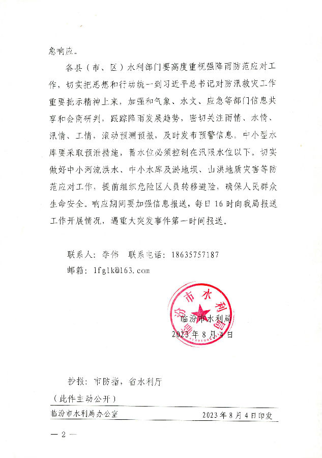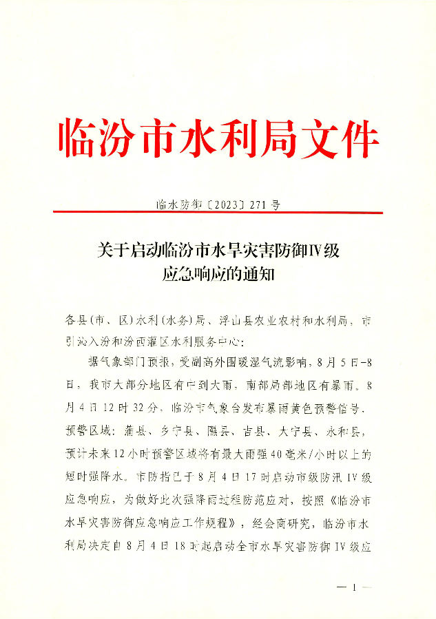 據(jù)氣象部門(mén)預(yù)報(bào),受副高外圍暖濕氣流影響,8月5 日一8 日,我市大部分地區(qū)有中到大雨,南部局部地區(qū)有暴雨。8月4日,臨汾市水利局發(fā)布《關(guān)于啟動(dòng)臨汾市水旱災(zāi)害防御Ⅳ級(jí)應(yīng)急響應(yīng)的通知 》。《通知》指出,為做好此次強(qiáng)降雨過(guò)程防范應(yīng)對(duì),按照《臨汾市水旱災(zāi)害防御應(yīng)急響應(yīng)工作規(guī)程》,經(jīng)會(huì)商研究,臨汾市水利局決定自 8月4 日18 時(shí)起啟動(dòng)全市水旱災(zāi)害防御 IV 級(jí)應(yīng)急響應(yīng)。