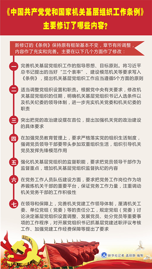 圖表:《中國共產黨黨和國家機關基層組織工作條例》主要修訂了哪些內容? 新華社記者 孟麗靜 編制