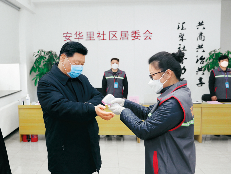 2020年2月10日,中共中央總書記、國家主席、中央軍委主席習近平在北京調研指導新冠肺炎疫情防控工作。這是習近平來到朝陽區安貞街道安華里社區,了解基層一線疫情聯防聯控情況。 新華社記者 鞠鵬/攝