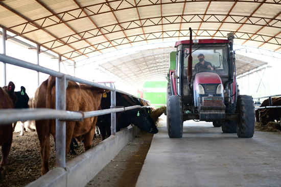 養(yǎng)殖場(chǎng)內(nèi),飼料攪拌車正給牛喂飼草。(陳立庚攝)