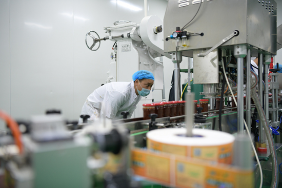 熟食加工生產(chǎn)線上,產(chǎn)業(yè)工人正盯著設(shè)備檢查。(陳立庚攝)