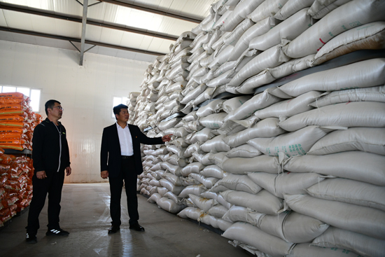 飼料加工廠內(nèi)張繼新問詢工作人員飼料儲(chǔ)備情況。(陳立庚攝)