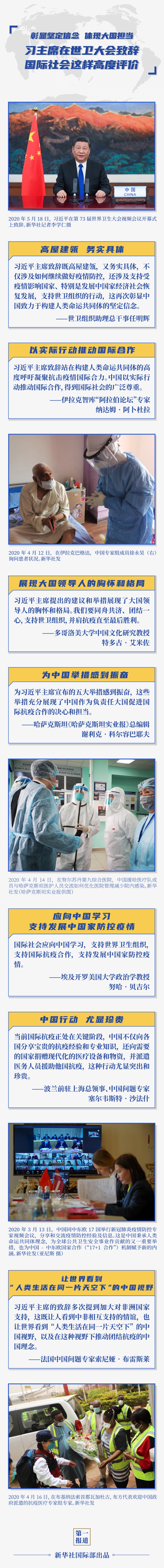 新華社北京5月19日電 5月18日晚,習近平主席在第73屆世界衛生大會視頻會議開幕式上發表題為《團結合作戰勝疫情共同構建人類衛生健康共同體》的致辭。習主席在致辭中提出加強疫情防控六項建議以及中國為推進全球抗疫合作五大舉措,彰顯了中國致力于構建人類命運共同體的堅定信念,體現了中國積極推動全球抗疫合作的大國擔當,得到國際社會積極呼應和高度評價。