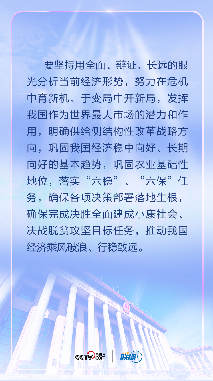 聯組會講話中,習近平用全面、辯證、長遠的眼光分析當前全球經濟形勢,剖析我國經濟的優勢和潛力,強調“在危機中育新機、于變局中開新局”,要求“確保各項決策部署落地生根,確保完成決勝全面建成小康社會、決戰脫貧攻堅目標任務”,推動我國經濟乘風破浪、行穩致遠。