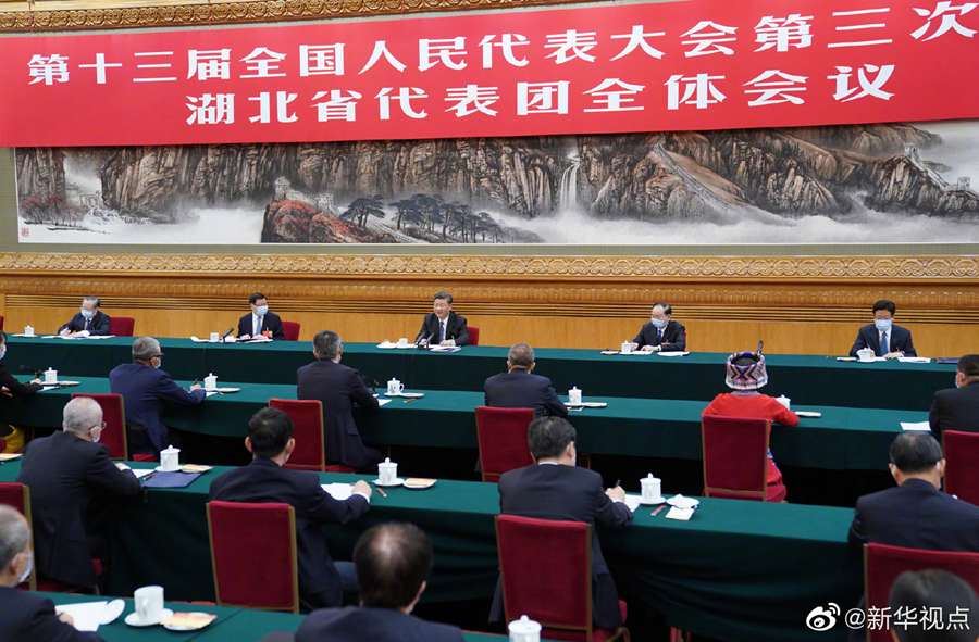 24日下午,中共中央總書記、國家主席、中央軍委主席習近平參加十三屆全國人大三次會議湖北代表團審議。(記者張曉松、朱基釵)