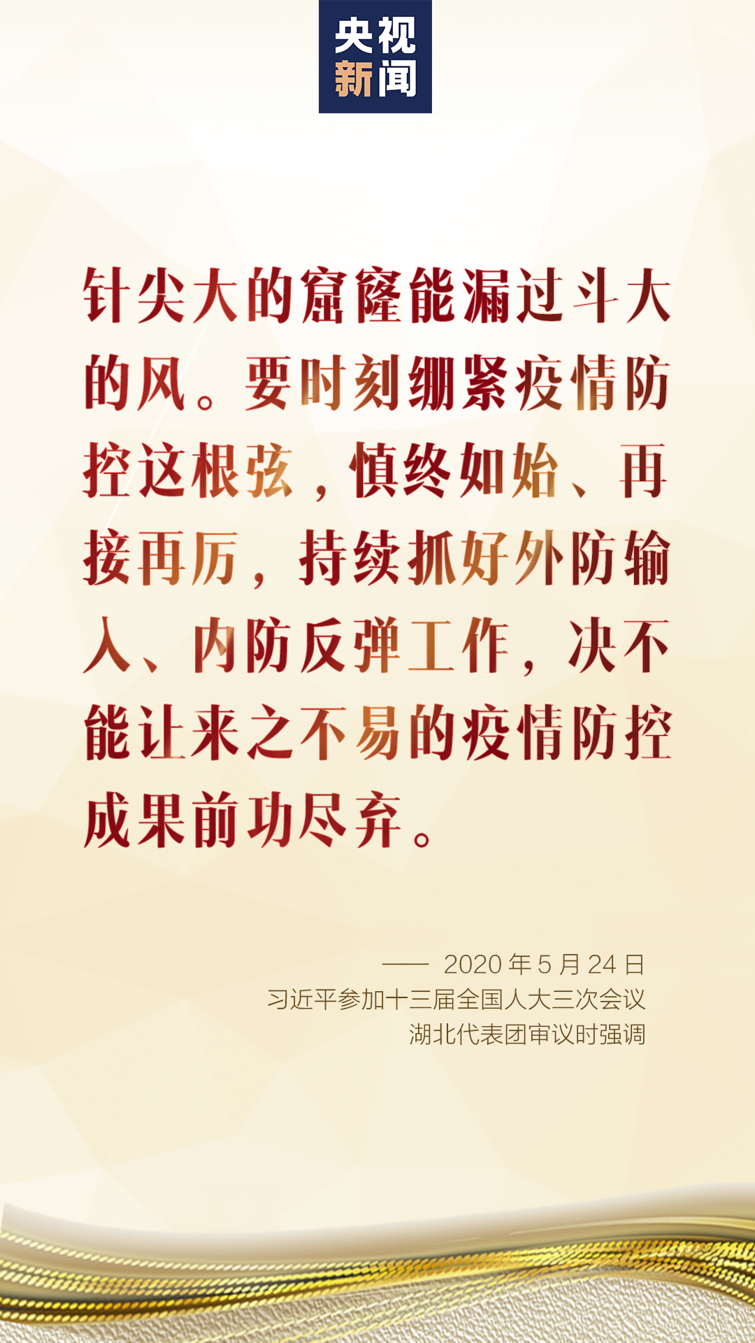 針尖大的窟窿能漏過斗大的風(fēng)。要時(shí)刻繃緊疫情防控這根弦,慎終如始、再接再厲,持續(xù)抓好外防輸入、內(nèi)防反彈工作, 決不能讓來之不易的疫情防控成果前功盡棄。