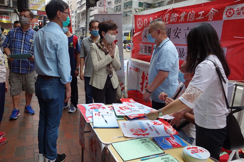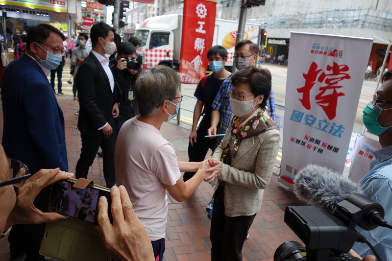 “香港各界撐國安立法聯合陣線”近日發起聯署行動,在網上及香港市區收集市民簽名,支持全國人大對香港維護國家安全立法。香港特區行政長官林鄭月娥28日中午赴北角的一個市區站點簽名,力撐相關活動。