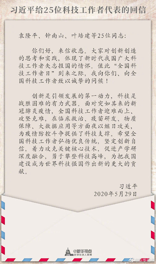 兩會(huì)剛剛閉幕。5月29日,一封充滿暖意的回信送到了25位科技工作者的手中。