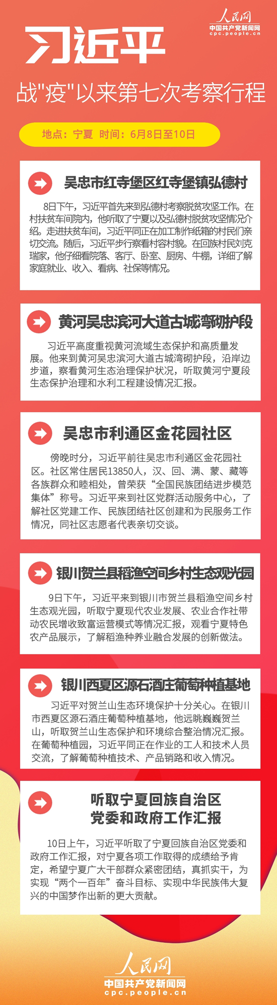6月8日至10日,中共中央總書記、國家主席、中央軍委主席習近平赴寧夏吳忠、銀川等地,深入農村、社區、防洪工程、農業產業園區等,就統籌推進常態化疫情防控和經濟社會發展工作、鞏固脫貧攻堅成果、加強生態環境保護、推動民族團結進步進行調研。