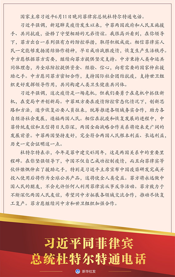 新華社北京6月11日電 國家主席習近平6月11日晚同菲律賓總統杜特爾特通電話。