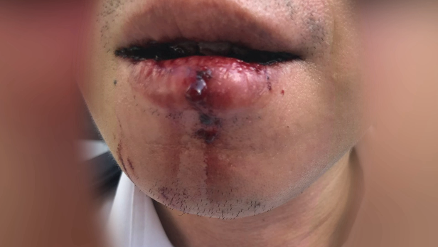 其間,有一些示威者用彈弓向警察射鋼珠,不幸的是,黃家倫就被其中一顆鋼珠射中了下唇部位。