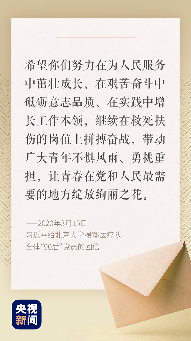 3月15日,習近平總書記給北京大學援鄂醫療隊全體“90后”黨員回信,向他們和奮斗在疫情防控各條戰線上的廣大青年致以誠摯的問候。