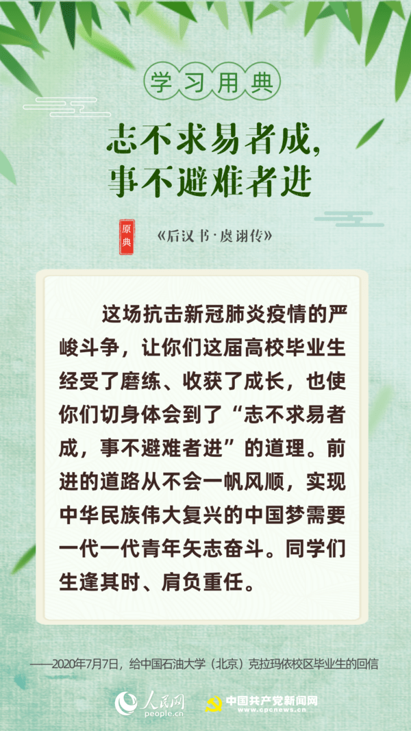 【編者按】“志不求易者成,事不避難者進(jìn)。”近日,習(xí)近平總書記給中國(guó)石油大學(xué)(北京)克拉瑪依校區(qū)畢業(yè)生回信,對(duì)廣大高校畢業(yè)生提出殷切期望?!叭松谇冢趧t不匱”“積土而為山,積水而為?!薄?span style="text-indent: 2em;">近年來,習(xí)近平多次引用詩句典故,激勵(lì)包含廣大青年在內(nèi)的全黨全國(guó)各族人民拼搏奮進(jìn)、埋頭苦干。正值“戰(zhàn)疫”“戰(zhàn)貧”關(guān)鍵時(shí)刻,人民網(wǎng)·中國(guó)共產(chǎn)黨新聞網(wǎng)與您一起回顧習(xí)近平講話中關(guān)于“奮斗”的10個(gè)名句。