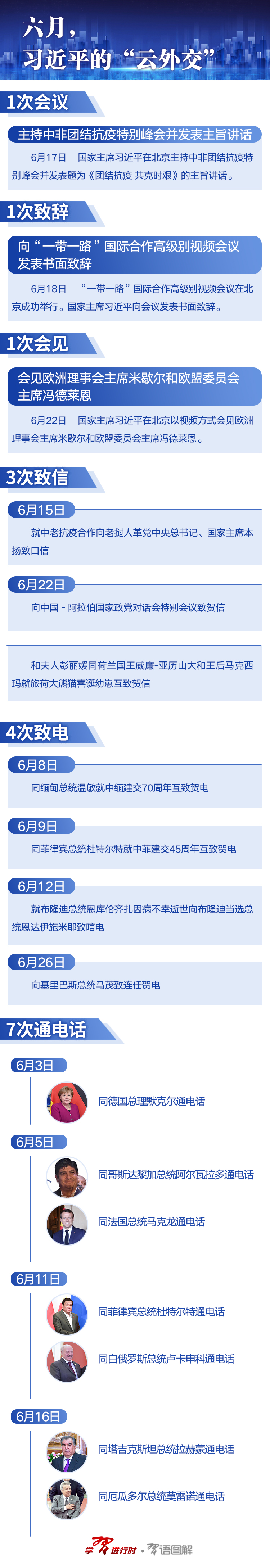 6月,習近平同德國總理默克爾、法國總統馬克龍、哥斯達黎加總統阿爾瓦拉多等外國領導人通電話;向中國-阿拉伯國家政黨對話會特別會議致賀信;以視頻方式主持中非團結抗疫特別峰會、會見歐洲理事會主席米歇爾和歐盟委員會主席馮德萊恩……