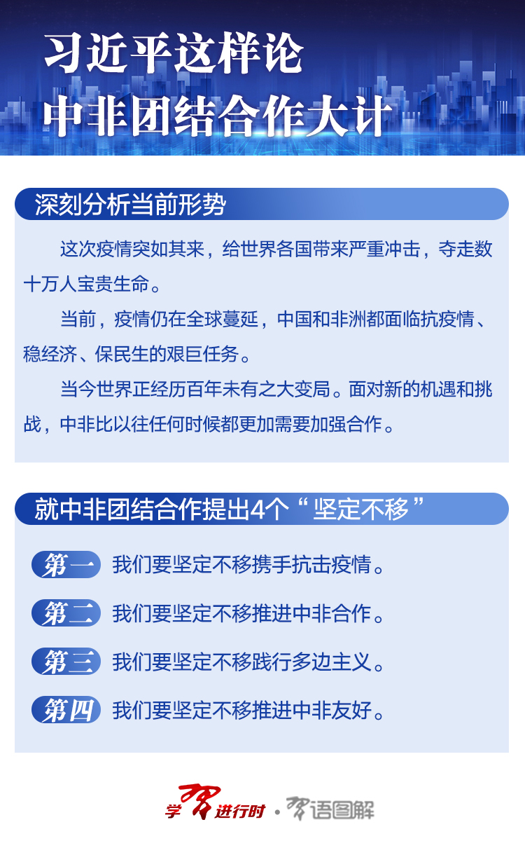 17日,習近平在中非團結抗疫特別峰會上提出四個“堅定不移”,指明了疫情形勢下中非抗疫及務實合作的前行路徑,指明了中非關系發展的未來方向。