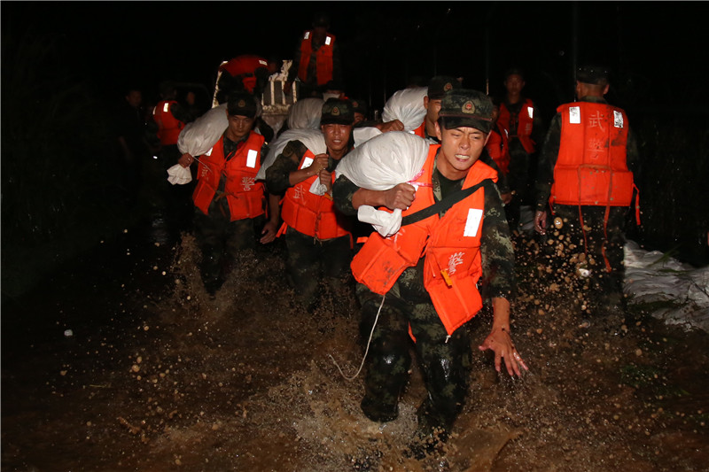 ▲ 2020年7月8日凌晨,武警江西省總隊景德鎮支隊官兵在景德鎮市珠山區觀音閣地區搬運沙袋加固昌江堤壩。