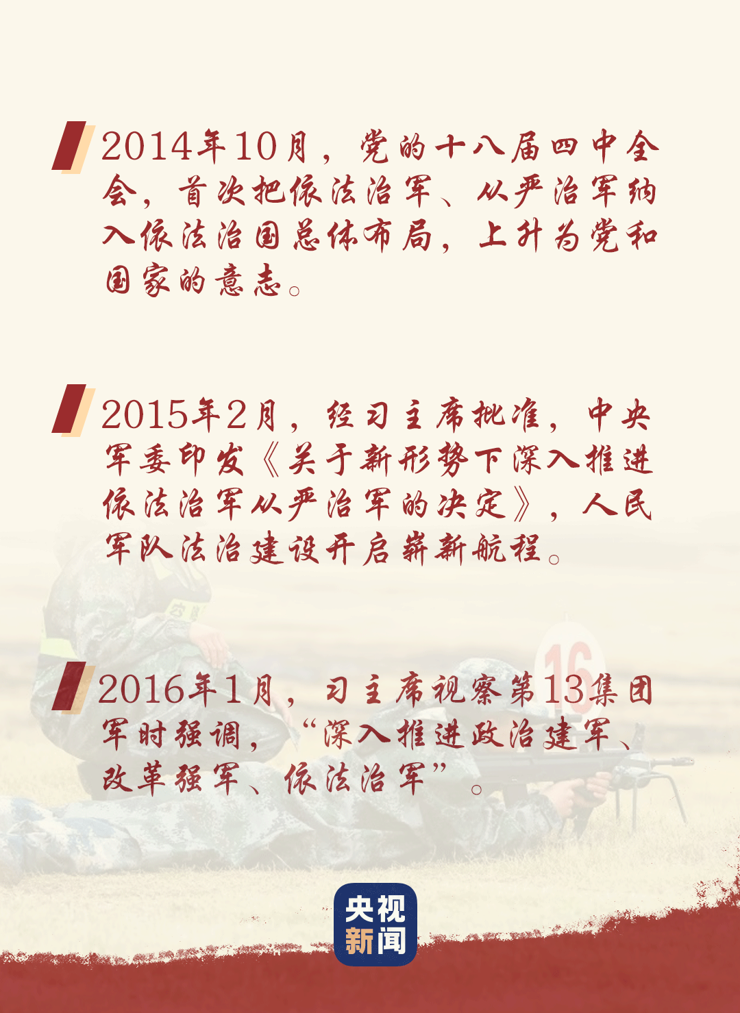 2012年12月,黨的十八大閉幕后不久,習近平主席首次到基層部隊視察時,就鮮明提出“依法治軍、從嚴治軍是強軍之基”。自此,以強軍目標為引領,人民軍隊依法治軍、從嚴治軍按下“快進鍵”,法治軍隊建設開創嶄新局面。
