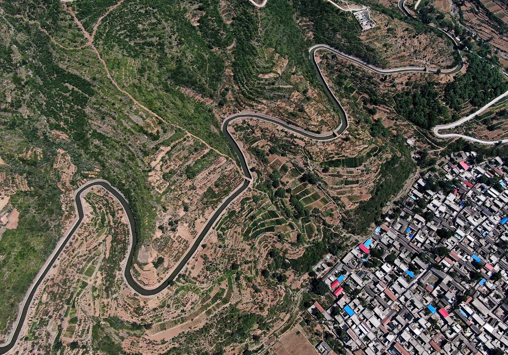 紅旗渠總干渠從一座村莊旁繞過(2019年7月5日無人機(jī)拍攝)。新華社記者 李安 攝