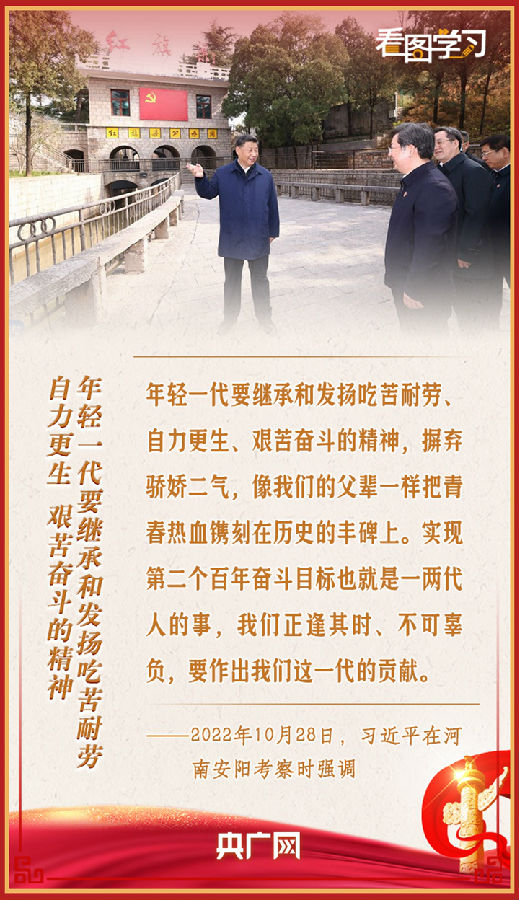 10月26日至28日,習近平總書記在陜西延安、河南安陽考察時強調,要大力弘揚自力更生、艱苦奮斗的精神。這是黨的二十大后,習近平總書記首次國內考察。黨的二十大召開期間,總書記也突出強調要堅定歷史自信,增強歷史主動,在新征程上團結奮斗,向著第二個百年奮斗目標進軍。一起來學習!