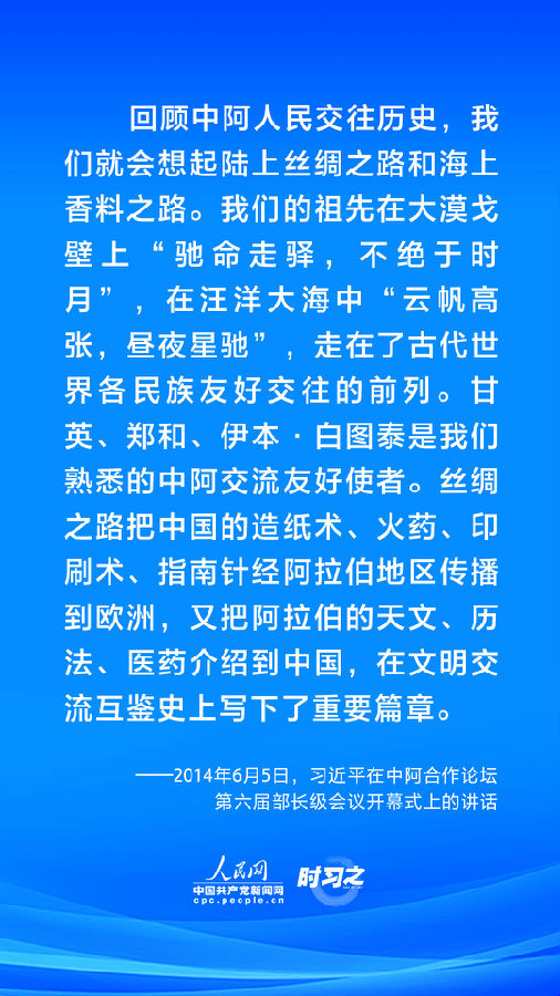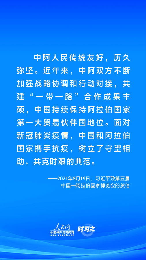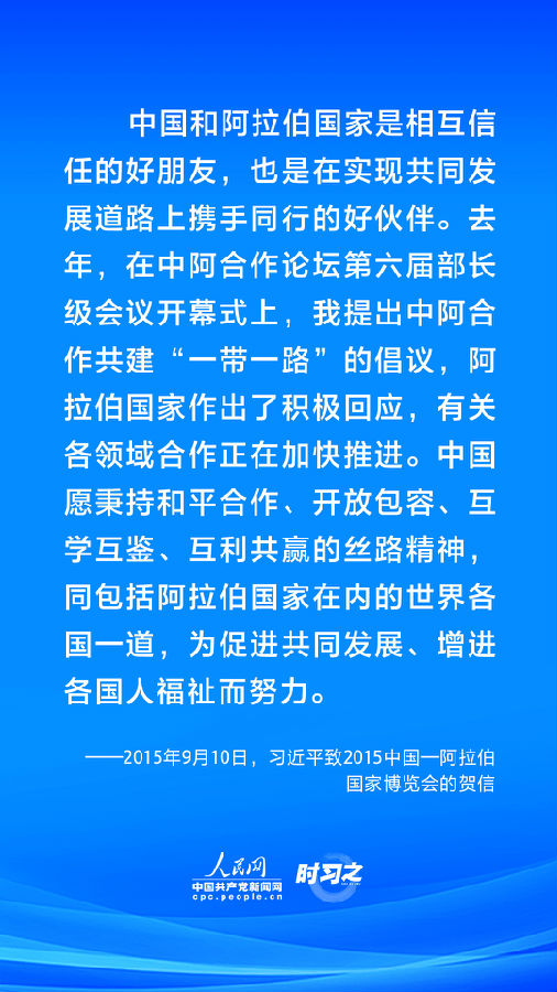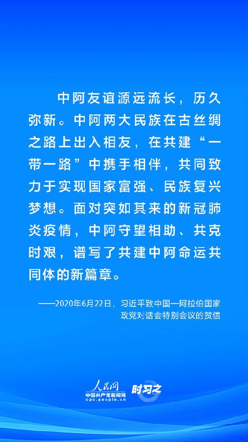 中國與阿拉伯國家友誼源遠流長,歷久彌堅。和平合作、開放包容、互學互鑒、互利共贏始終是中阿交往的主旋律。習近平主席多次在不同場合談到中阿友誼,提出攜手打造面向新時代的中阿命運共同體,積極推動中阿命運共同體建設不斷走深走實,造福雙方人民。