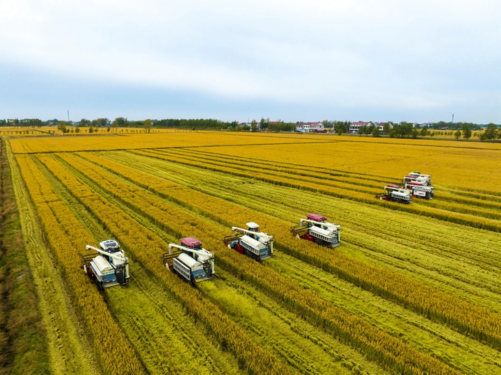 △2022年10月26日,江蘇省連云港市東海縣平明鎮(zhèn),金色稻田喜獲豐收。