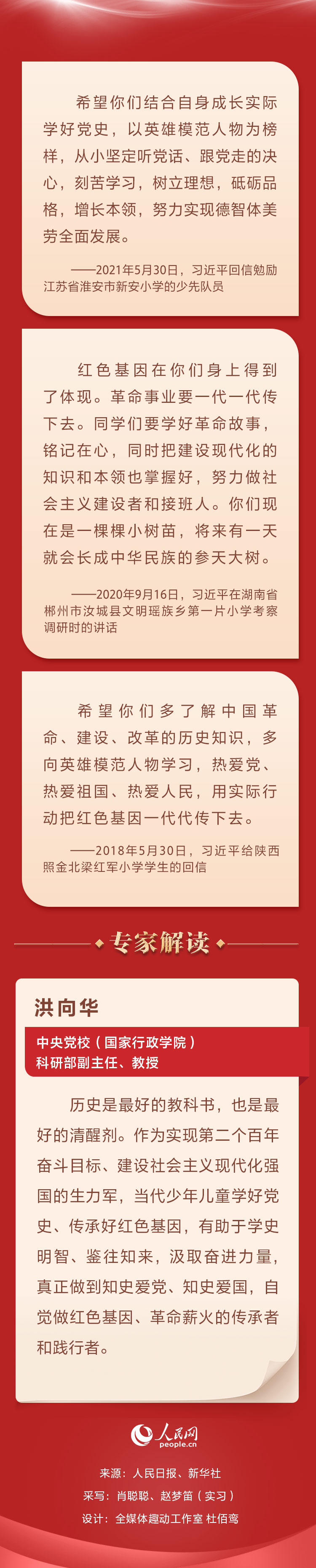 “你們現在是一棵棵小樹苗,將來有一天就會長成中華民族的參天大樹。”學好革命故事,傳承紅色基因,始終是中共中央總書記、國家主席、中央軍委主席習近平對廣大少年兒童的殷切期望。人民網帶您重溫重要論述并邀請專家解讀。