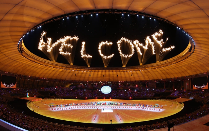 在主題曲《成就夢想》歌聲中,道道金色光芒灑向地面,代表參賽國家和地區(qū)的旗幟匯聚于場地中央,寓意地球村的居民們沐浴在同一片陽光之下,以包容的胸懷構(gòu)建和而不同的精神家園。