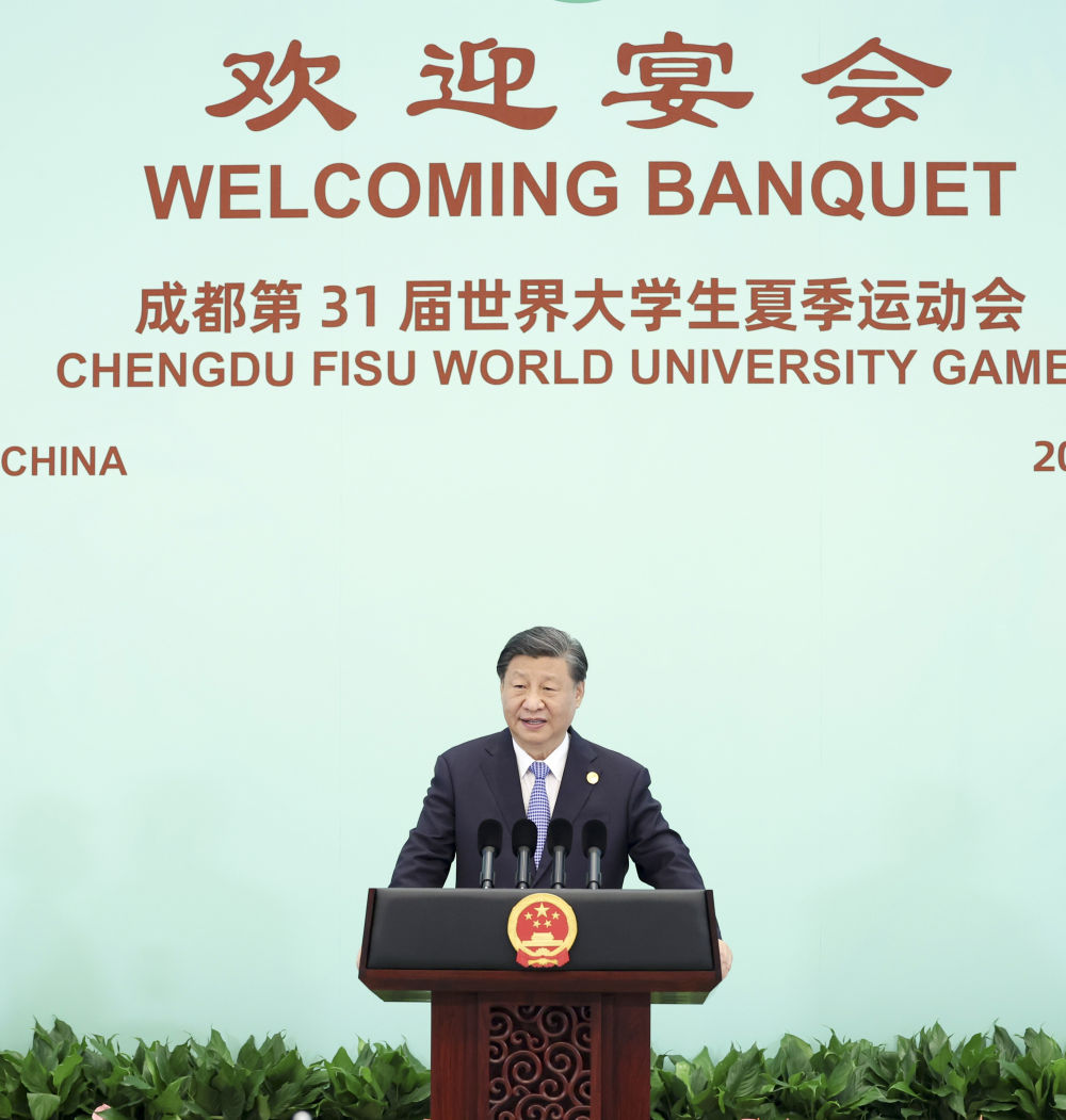 7月28日中午,國家主席習(xí)近平和夫人彭麗媛在四川省成都市金牛賓館舉行宴會(huì),歡迎出席成都第31屆世界大學(xué)生夏季運(yùn)動(dòng)會(huì)開幕式的國際貴賓。這是習(xí)近平發(fā)表致辭。新華社記者 丁海濤 攝