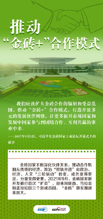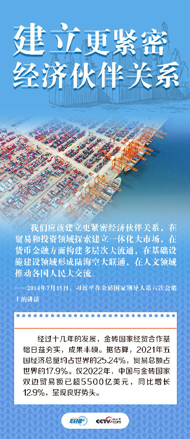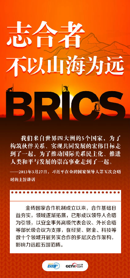 “我們五國雖然山海相隔,但懷著合作共贏的共同目標走到了一起”。“獨木不成林。在經濟全球化深入發展的時代條件下,金磚國家發展不能獨善其身,必須在謀求本國發展的同時促進各國共同發展”。十多年來,習近平主席多次出席或主持金磚國家領導人會晤,論述金磚合作之道,提出“金磚+”合作理念,為推動金磚合作走深走實貢獻中國智慧,在金磚國家合作進程中留下深刻的“中國印記”。
