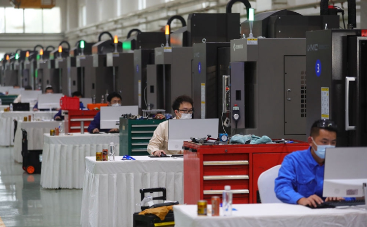 參賽選手在在2022“一帶一路”暨金磚國家技能發展與技術創新之“通用技術杯”數控多軸加工大賽中比拼(2022年11月10日攝)。新華社記者 楊青 攝