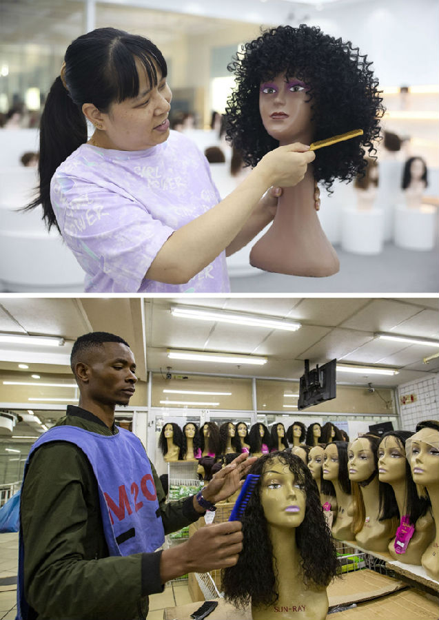 拼版照片:上圖為2023年5月25日,工人在湖南邵陽陽光發品有限公司展廳展示假發(新華社記者薛宇舸攝);下圖為2023年6月9日,一名店員在湖南邵陽陽光發品有限公司位于南非約翰內斯堡的店鋪內展示假發(新華社記者張譽東攝)。新華社發