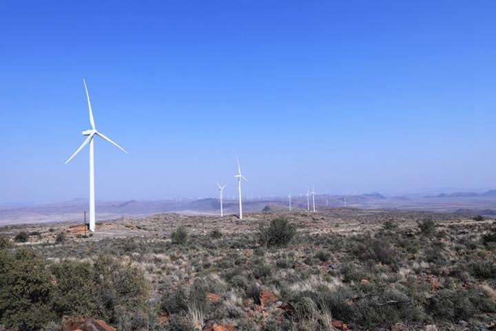 這是8月10日在南非北開普省德阿鎮拍攝的中國國家能源集團龍源電力南非公司運營的德阿風電項目風機。新華社記者 董江輝 攝