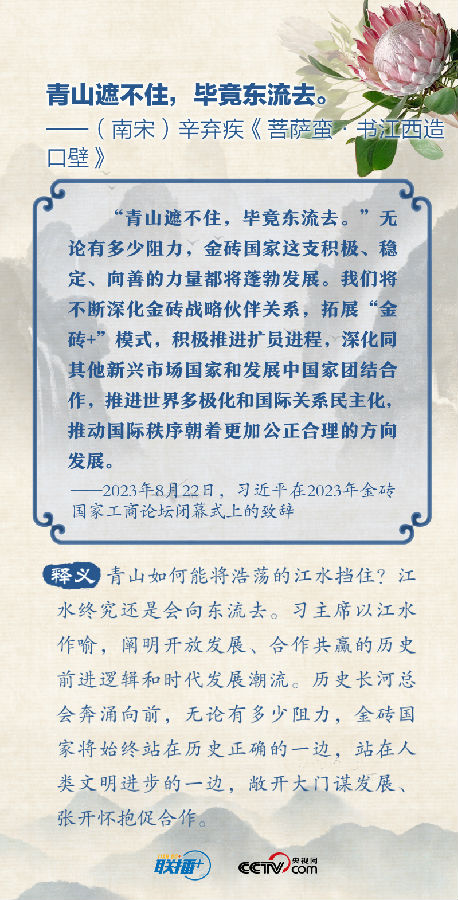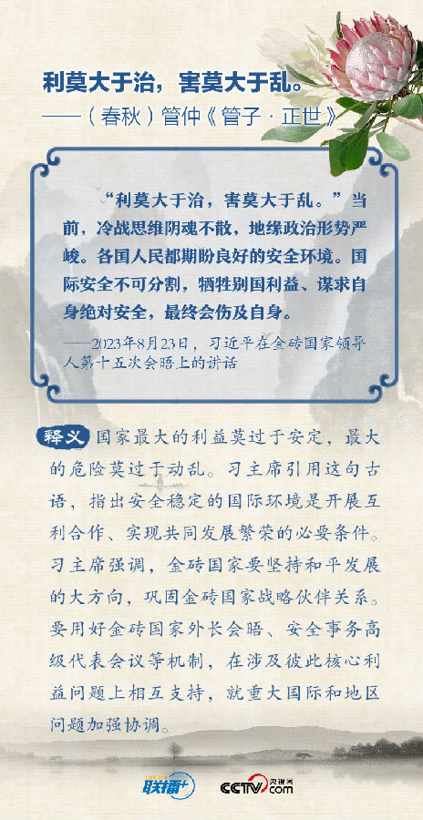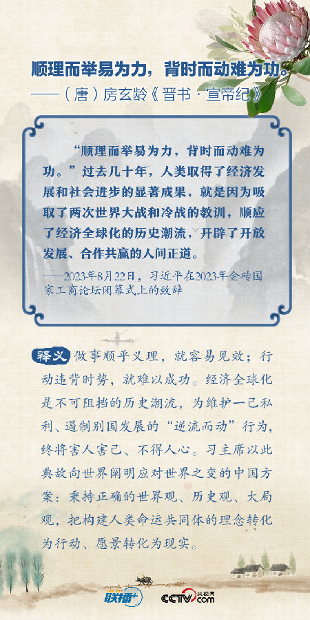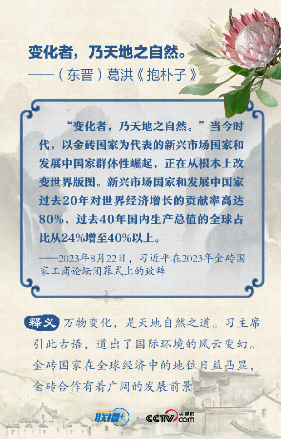 聯播+“順理而舉易為力,背時而動難為功”“變化者,乃天地之自然”“利莫大于治,害莫大于亂”…… 2023年的“金磚時間”里,習近平主席多次在講話中引經據典,闡述金磚國家的合作與發展之道。央視網《聯播+》特擷取習主席用典金句,與您一起學習。