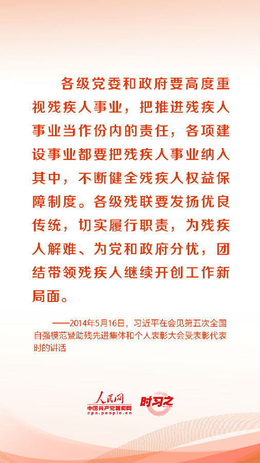 殘疾人事業是“春天的事業”。對于發展這項事業,習近平總書記時時在心、屢屢部署。他表示“不斷滿足人民群眾對美好生活的需要,必須保護好殘疾人權益,殘疾人事業一定要繼續推動”。
