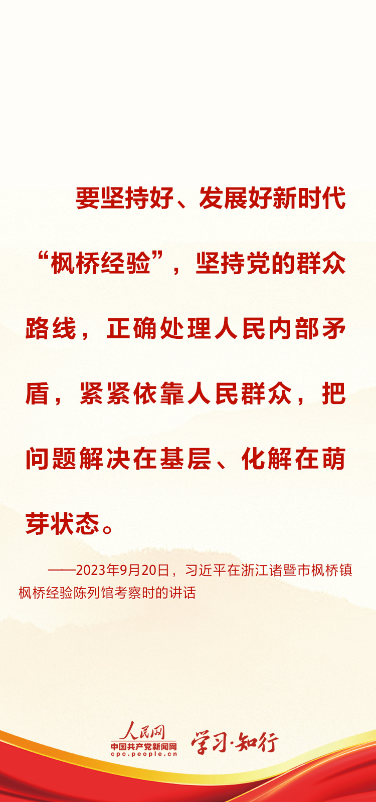 2023年9月20日下午,中共中央總書記、國家主席、中央軍委主席習(xí)近平來到“楓橋經(jīng)驗(yàn)”發(fā)源地諸暨市楓橋鎮(zhèn),參觀楓橋經(jīng)驗(yàn)陳列館,了解新時(shí)代“楓橋經(jīng)驗(yàn)”的生動(dòng)實(shí)踐。