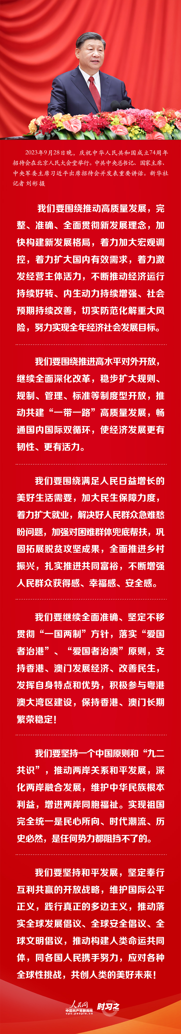 9月28日晚,慶祝中華人民共和國成立74周年招待會在人民大會堂舉行。中共中央總書記、國家主席、中央軍委主席習近平出席招待會并發表重要講話。他強調,新征程上,我們的前途一片光明。團結就是力量,信心賽過黃金。我們要堅定信心,振奮精神,團結奮斗,繼續爬坡過坎、攻堅克難,堅定不移朝著強國建設、民族復興的宏偉目標奮勇前進。