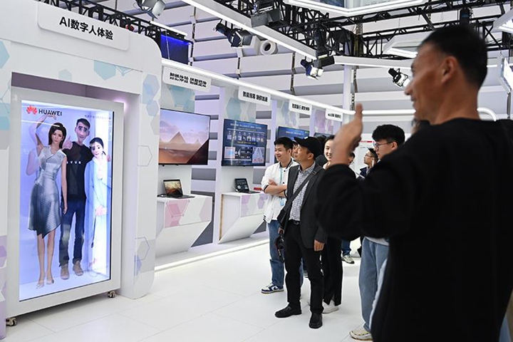△2023年11月7日,2023年世界互聯網大會“互聯網之光”博覽會在浙江烏鎮開幕。圖為觀眾在展臺體驗與AI數字人合影。