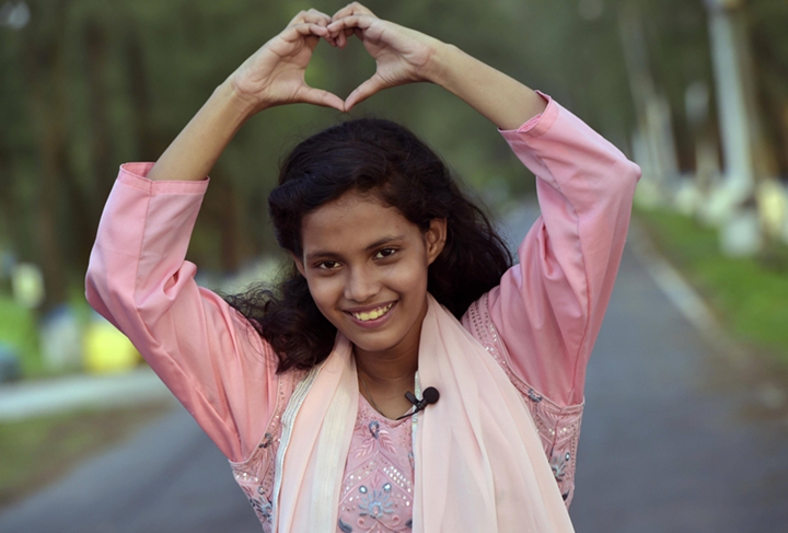2023年5月26日,孟加拉國兒童阿里法·沁做出愛心手勢表達對中國的愛意。