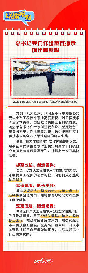 聯(lián)播+ 在“國家工程師獎”首次評選表彰之際,習(xí)近平總書記專門作出重要指示,向受表彰的“國家卓越工程師”和“國家卓越工程師團(tuán)隊(duì)”致以熱烈祝賀。