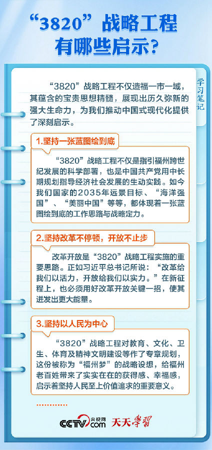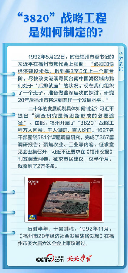 天天學習 上世紀90年代,習近平在福州工作期間,親自主持編制了《福州市20年經濟社會發展戰略設想》(簡稱“3820”戰略工程),系統謀劃了福州3年、8年、20年經濟社會發展的目標、步驟、布局、重點等,為福州擘畫了美好藍圖,確立了總綱領、總方略。