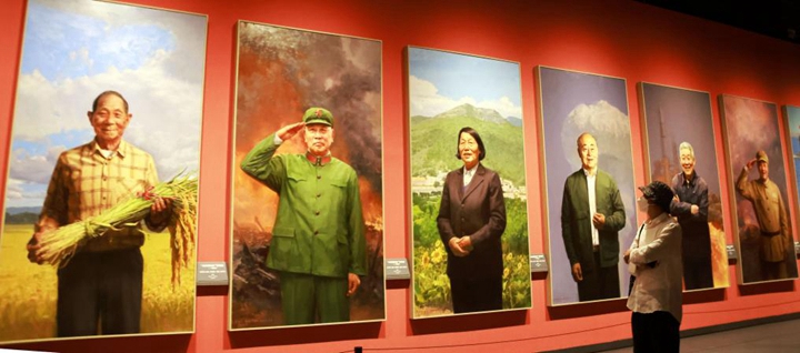 2022年10月1日,觀眾在“筑夢——我們的新時(shí)代美術(shù)攝影作品展”上觀看油畫《“共和國勛章”獲得者》。新華社記者 潘旭 攝