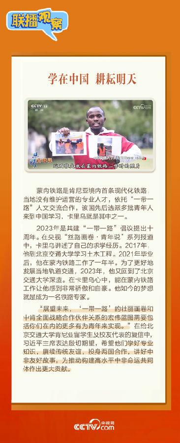 聯播+ 日前,北京交通大學肯尼亞留學生及校友代表致信習近平主席,表示非常高興來到中國學習鐵路運營管理知識。1月17日,習近平主席復信表達欣慰和喜悅之情,“蒙內鐵路是中肯共建‘一帶一路’旗艦項目和成功典范。我高興地看到,你們因這條‘幸福路’與中國結緣……”