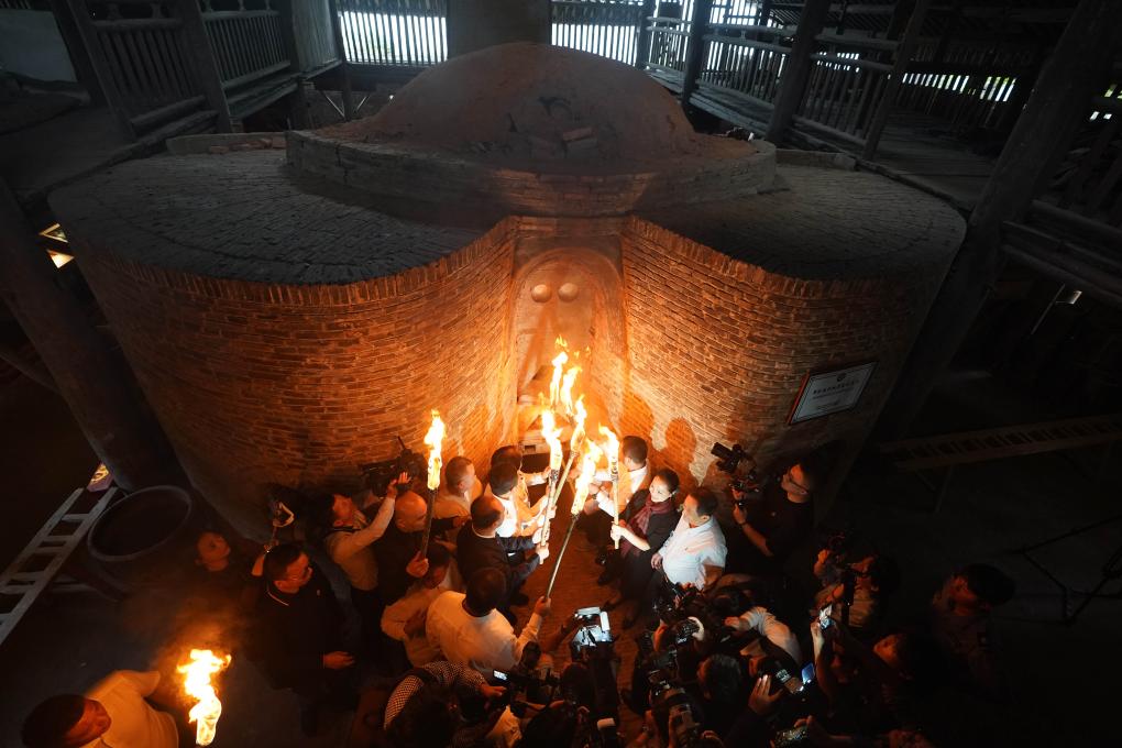 ??2023年10月19日,嘉賓與把樁師傅一起對葫蘆窯進行復燒點火。當日,作為2023中國景德鎮國際陶瓷博覽會的活動之一,景德鎮古窯民俗博覽區對重建的明代葫蘆窯進行點火復燒。同時,景德鎮歷代瓷窯活態傳承紀實館開館。新華社記者 周密 攝