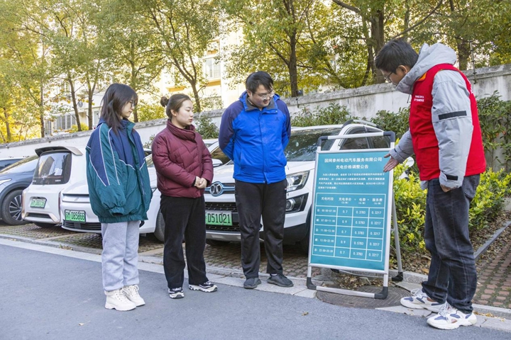 △ 2023年12月1日,工作人員在江蘇省泰州市蘇源花園二期居民區給車主講解執行居民電價相關優惠政策。