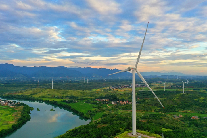 △ 湖南省永州市的風(fēng)力發(fā)電風(fēng)車與藍天、綠水、田野交相輝映,構(gòu)成一幅美麗的生態(tài)畫卷。