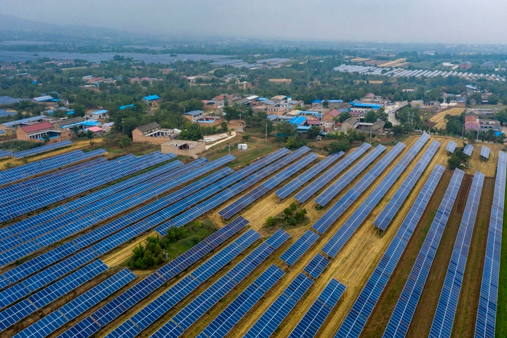 2025年6月25日在山西省運(yùn)城市芮城縣夭上村拍攝的光伏基地(無人機(jī)照片)。新華社記者 楊晨光 攝