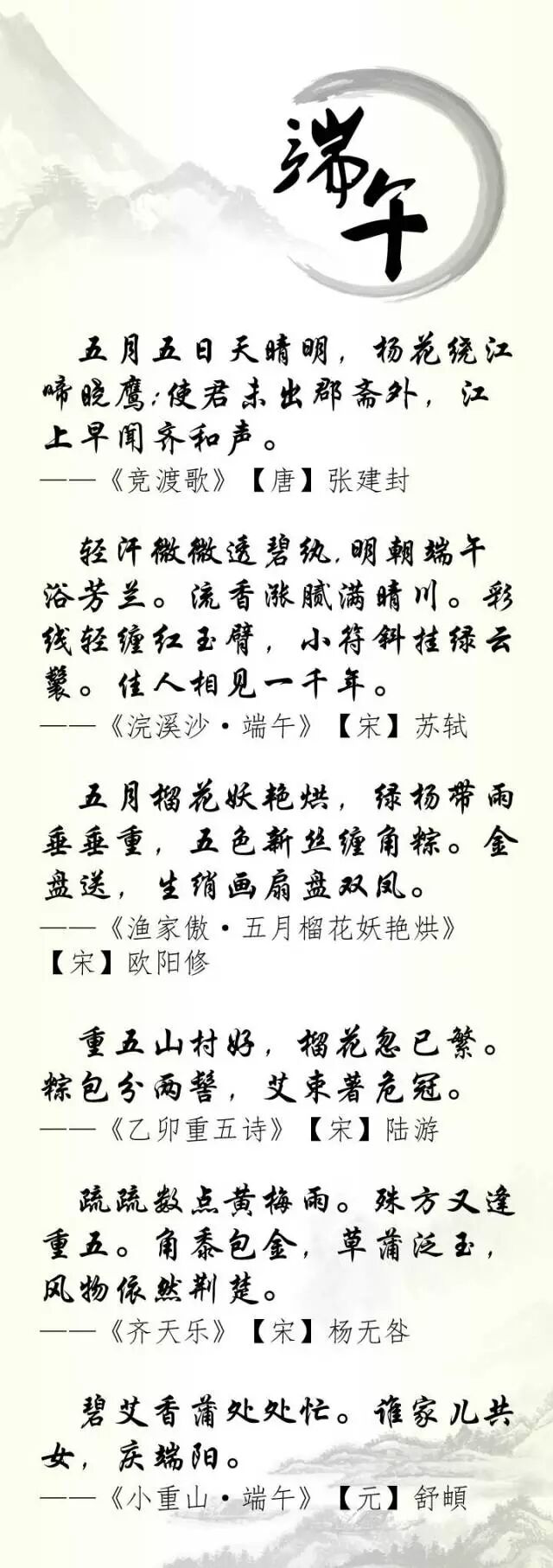 習近平總書記指出,“民族文化是一個民族區別于其他民族的獨特標識。”“中華文化積淀著中華民族最深沉的精神追求,是中華民族生生不息、發展壯大的豐厚滋養;中華優秀傳統文化是中華民族的突出優勢,是我們最深厚的文化軟實力”。吃粽子,賽龍舟,喝雄黃酒,掛蒿草、艾葉……端午節是中國的傳統節日,從古至今,文學名家們對端午這一重要節日的習俗皆有描寫,不同時代的端午節,變換的是時空,不變的是炎黃子孫共同的傳統文化和相通的情懷。請隨1號線上穿越時空,共同品味古今一脈相承的端午文化,感受那份濃濃的民族認同感和民族自信心。 古典詩詞里的端午 現當代作家筆下的端午 家鄉的端午,很多風俗和外地一樣。系百索子。五色的絲線擰成小繩,系在手腕上。絲線是掉色的,洗臉時沾了水,手腕上就印得紅一道綠一道的。做香角子。絲絲纏成小粽子,里頭裝了香面,一個一個串起來,掛在帳鉤上。貼五毒。紅紙剪成五毒,貼在門檻上。貼符。這符是城隍廟送來的。城隍廟的老道士還是我的寄名干爹,他每年端午節前就派小道士送符來,還有兩把小紙扇。 ——汪曾祺《端午的鴨蛋》 端午日,當地婦女、小孩子,莫不穿了新衣,額角上用雄黃蘸酒畫了個王字。任何人家到了這天必可以吃魚吃肉。大約上午11點鐘左右,全茶峒人就吃了午飯。把飯吃過后,在城里住家的,莫不倒鎖了門,全家出城到河邊看劃船。 ——沈從文《端午日》 清明過后,天氣越來越暖了,野花開了,草也長高了,這時端午節來了。家家戶戶提前把風干的粽葉泡好,將糯米也泡好,包粽子的工作就開始了。粽子一般都包成菱形,若是用五彩線捆粽葉的話,粽子看上去就像花荷包了。粽子里通常要夾餡的,愛吃甜的就夾上紅棗和豆沙,愛吃咸的就夾上一塊腌肉。粽子蒸熟后,要放到涼水中浸著,這樣放個兩天三天都不會壞…… ——遲子建《故鄉的吃食》