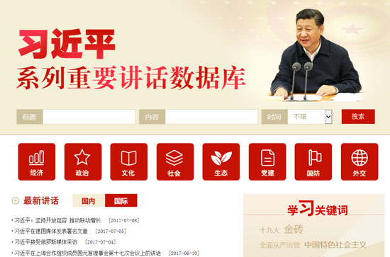 人民網·中國共產黨新聞網精心打造的"習近平系列重要講話數據庫"(http://jhsjk.people.cn/),幫助你一鍵在手,要點全通,成為全黨、全國人民認真學習習近平總書記系列重要講話和治國理政新理念新思想新戰略的金鑰匙。